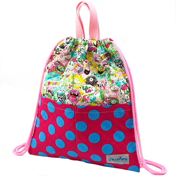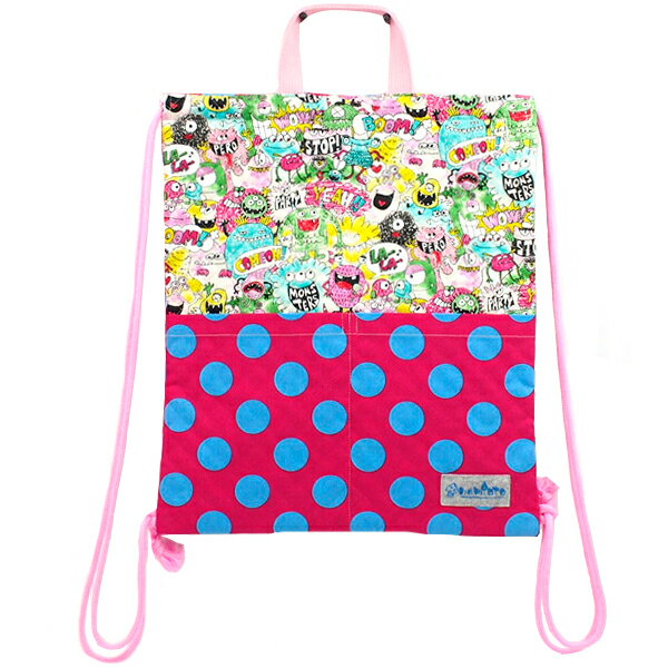 モンスターパーティ ピンク ナップサック(2ポケット)ハンドメイド namioto 安心 安全 日本製 ナップ リュック サブバッグ お着替え入れ 子供ナップサック お出かけ 丈夫 長持ち キルト 持ち手付きナップ 背負う 小学校 幼稚園 保育園 モンスター ドット 女の子 かわいい